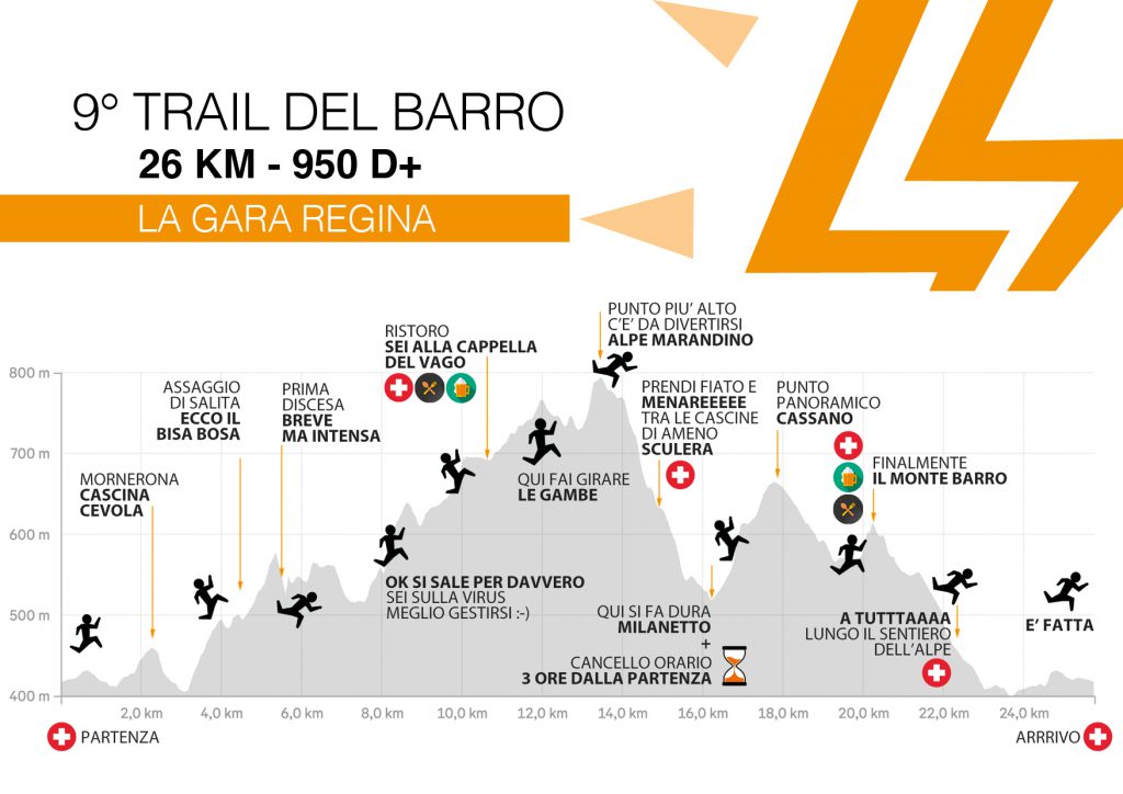 26 KM per LA REGINA del TRAIL DEL BARRO, su e giù per i nostri sentieri da correre tutti d’un fiato. Strappi che non ti aspetti, discese veloci e divertenti dove andare a tutta… lunghi tratti da correre, ci amerai e poi ci odierai, un sali e scendi di emozioni e continui cambi di ritmo. I 950 D+ di dislivello sono solo un dettaglio. Il passaggio tra le cascine di Ameno, darà un tocco in più, suggestivi gli scorci sul Monte Rosa, il Mottarone e il Monte Barone. Potrete sfiorare e toccare con mano le antiche frazioni di Ameno dove il tempo sembra essersi fermato. Ma voi dovrete correre, un cancello orario posto a MILANETTO (3 ore dalla partenza) vi metterà la giusta pressione. Il Monte Barro sarà il cuore pulsante della gara dove ad attendervi ci saranno le Volpi più scatenate e i loro amici, prima di tuffarvi per la discesa finale sul sentiero dell’Alpe. Un finale ancora da correre, uno strappetto che noi chiamiamo il piccolo Mortirolo, sarà il punto in cui potrai dire “adesso è finita”… anche se in realtà ci sarà ancora da correre 🙂